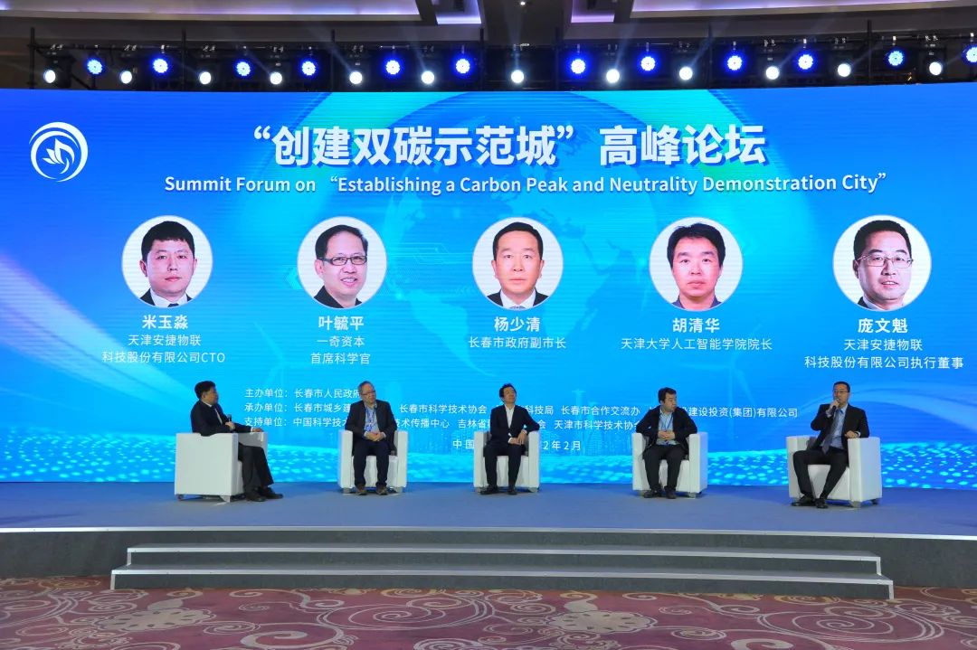 長春市副市長楊少清、雙碳技術(shù)傳播中心副主任兼安捷物聯(lián)執(zhí)行董事龐文魁、軟通動力CTO葉毓平、天津大學(xué)人工智能學(xué)院院長胡清華、安捷物聯(lián)高級副總裁米玉淼五位嘉賓,以【發(fā)揮科技創(chuàng)新引領(lǐng),推進雙碳示范城建設(shè)】為議題,共同展開探討。