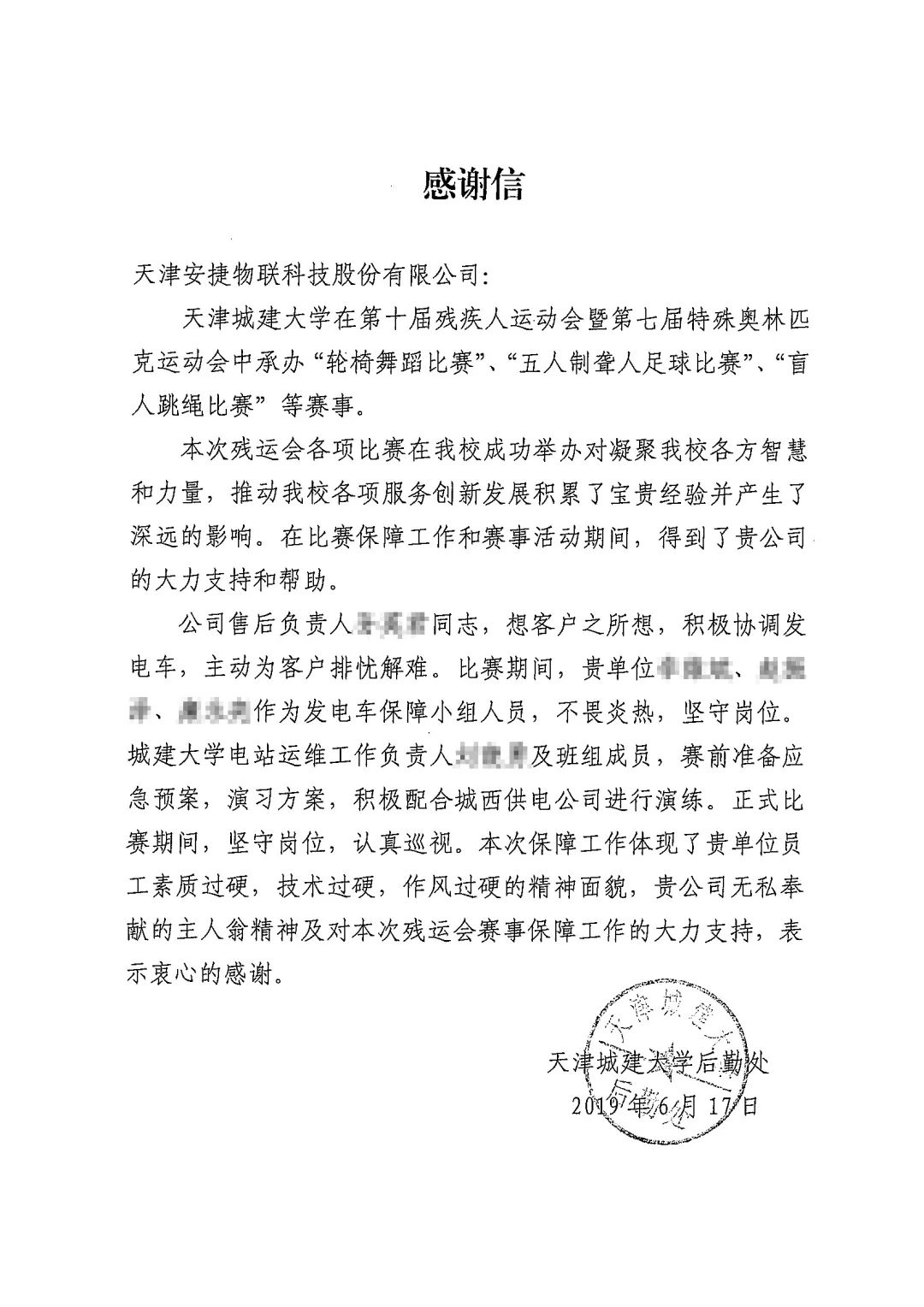 圖為殘運(yùn)會(huì)保電現(xiàn)場(chǎng)與天津城建大學(xué)感謝信