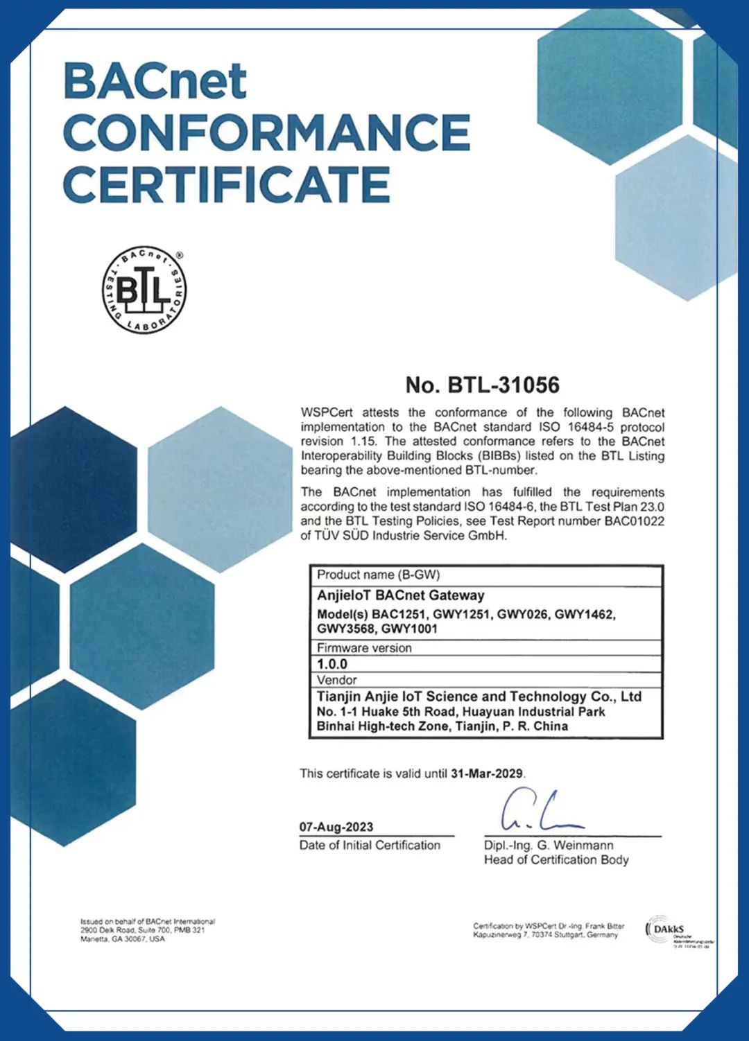 近日,由天津安捷物聯(lián)科技股份有限公司自主研發(fā)設(shè)計的GWY系列智能網(wǎng)關(guān)產(chǎn)品成功通過BTL(BACnet Testing Laboratories )認證,該項認證是國際樓宇自控領(lǐng)域的第一權(quán)威認證。